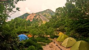 初日は高瀬ダムからスタートして烏帽子小屋近くのテント場に泊まる予定でしたが、急登のブナ立尾根の登りがまぁきつい。5時間登りっぱなしで、烏帽子小屋に着いたときは体力を使い果たし夕方6時にはテントで就寝。